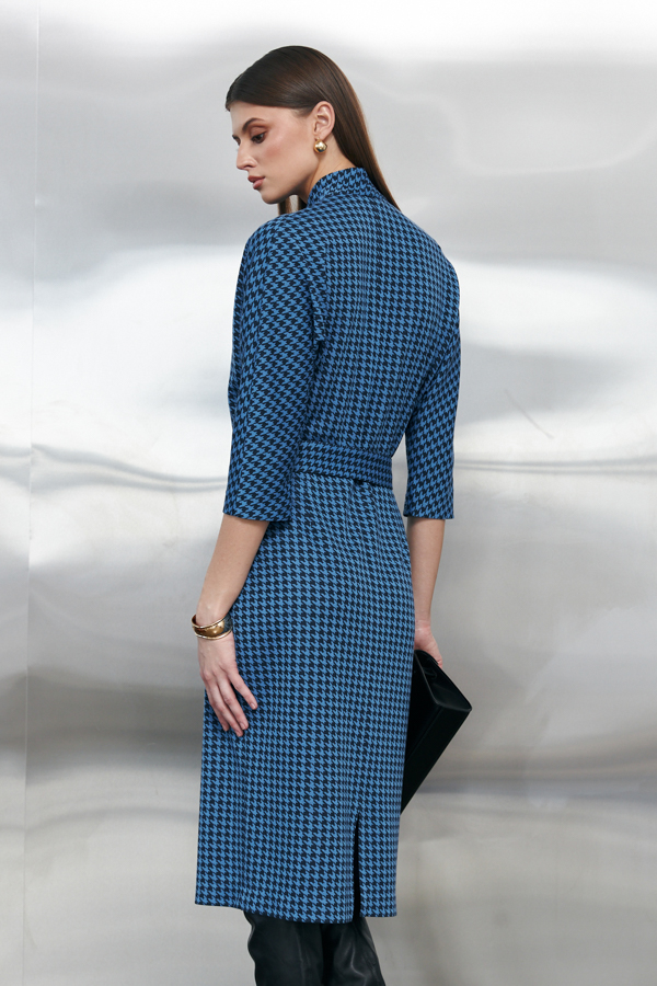 Платье из эластичного полотна с жаккардовым узором. Изделие свободное в верхней части и прилегающее в области талии и бёдер. Лиф изделия оригинального кроя в стиле кимоно. Цельнокроеная стойка переходящая в запах, визуально делает фигуру стройнее. По центру задней части платья выполнен шов, снизу небольшой разрез. В комплекте пояс. В таблице размеров представлены параметры человека, а не изделия.