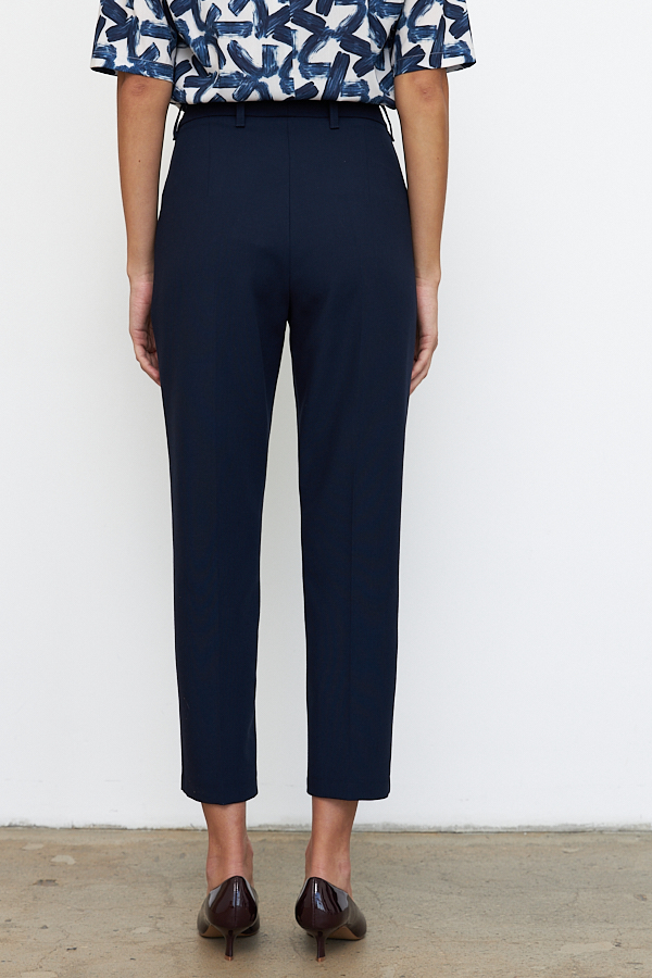 Брюки прямого силуэта, зауженные книзу из костюмной ткани. Застёжка на молнию-гульфик и крючок. Карманы с подкройным бочком. Притачной пояс со шлёвками.