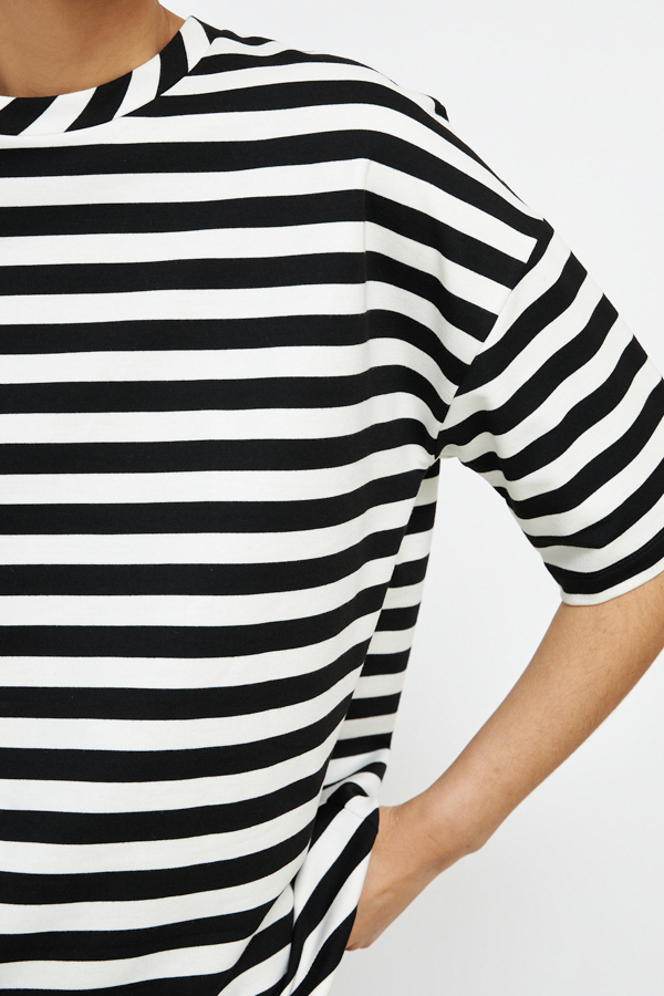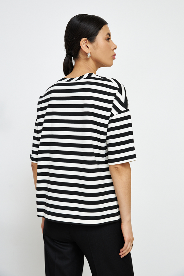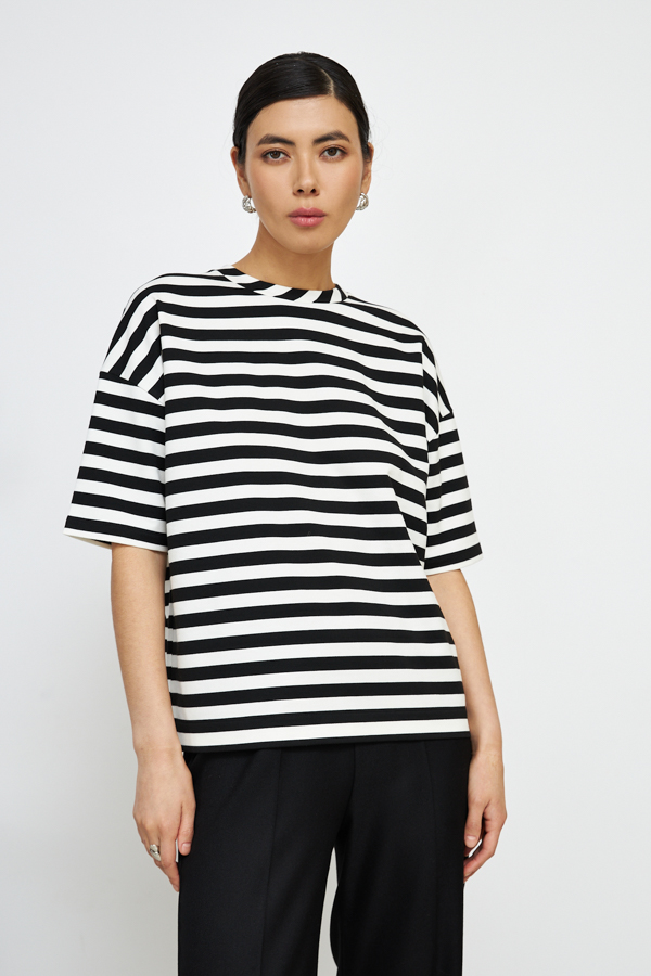 Джемпер свободного силуэта со спущенной линией плеча и рукавом до локтя выполнен из эластичного полотна. Вырез горловины оформлен бейкой из основной ткани. В таблице размеров представлены параметры человека, а не изделия.