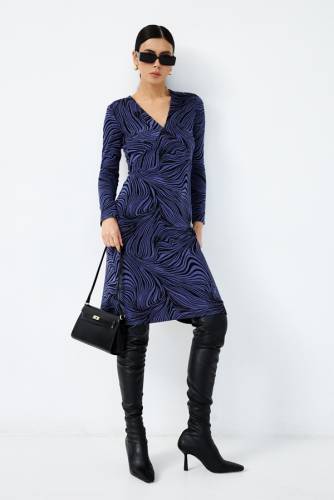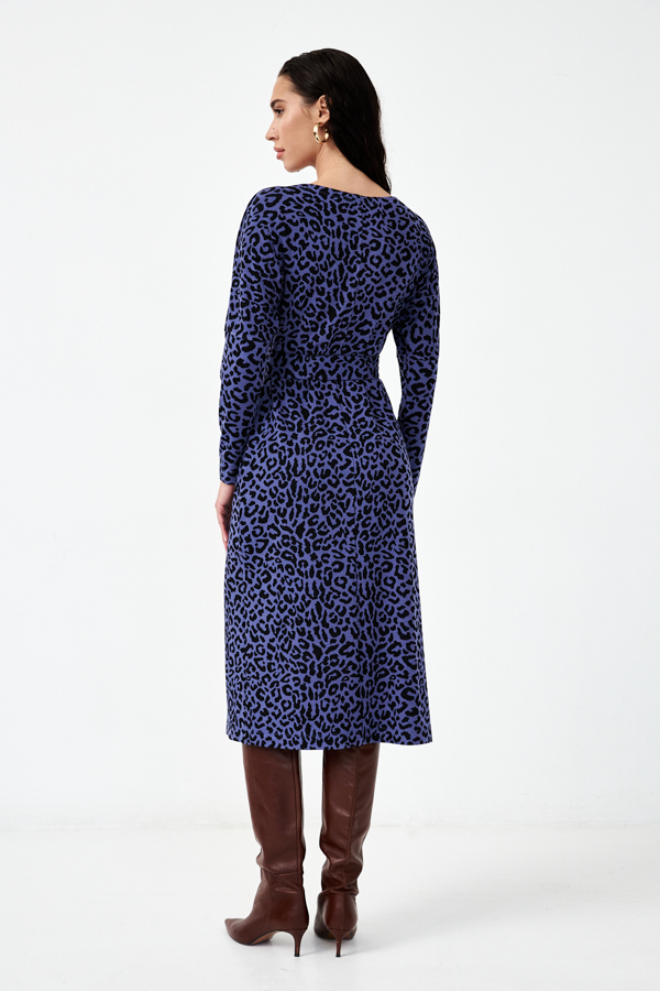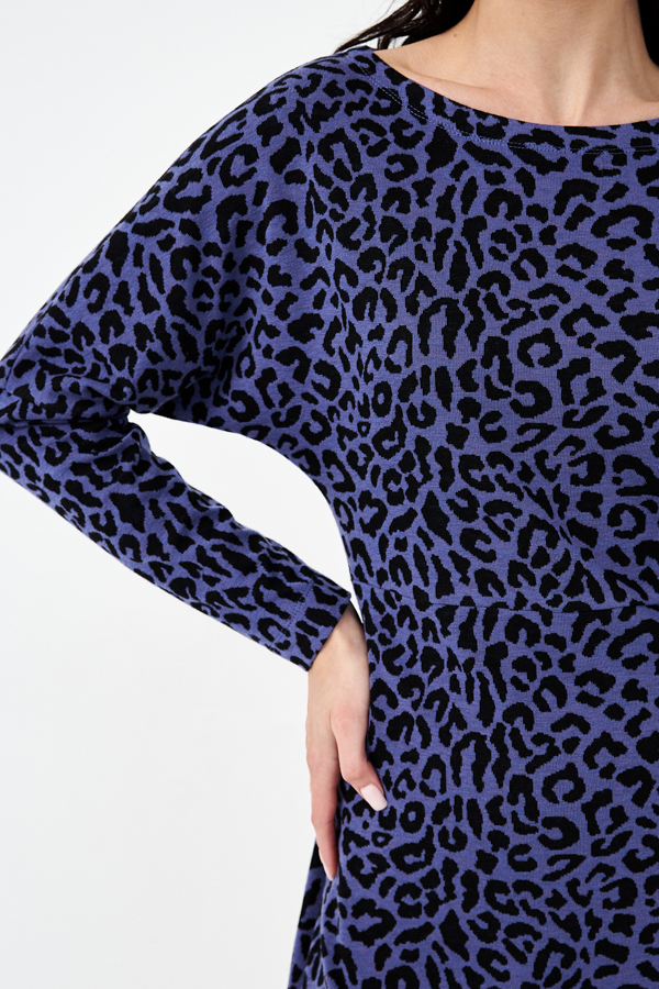 Платье из эластичного полотна с жаккардовым анималистичным узором. Изделие свободное в верхней части и прилегающее в области талии и бёдер. Рукав оригинального кроя в стиле кимоно. Круглый вырез горловины. В комплекте пояс из основной ткани. В таблице размеров представлены параметры человека, а не изделия.