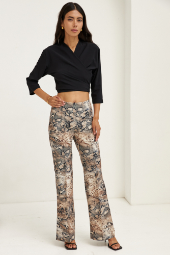 Брюки прямого силуэта из эластичного полотна. Пояс притачной с эластичной резиной. На передней части брюк застрочены стрелки.