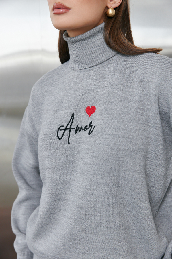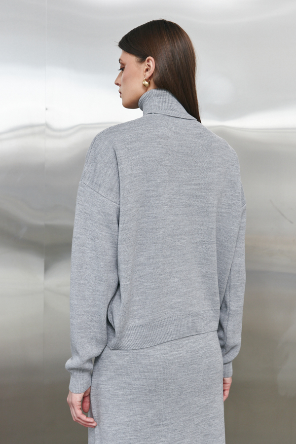 Джемпер свободного силуэта с вышивкой в области груди. Рукав втачной в спущенную пройму. Низ изделия и низ рукава оформлены резинкой, воротник-стойка с отворотом. Изделие выполнено из меланжевой пряжи.