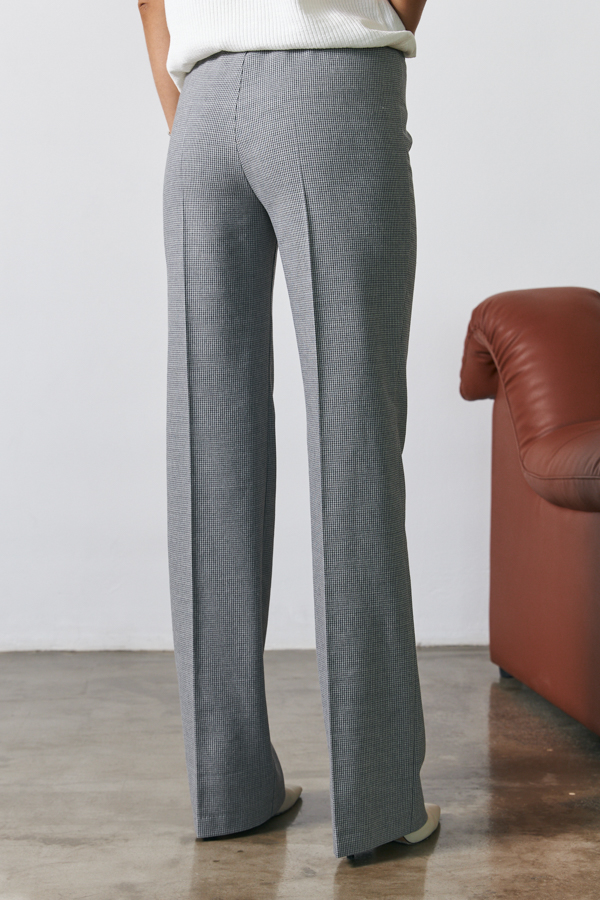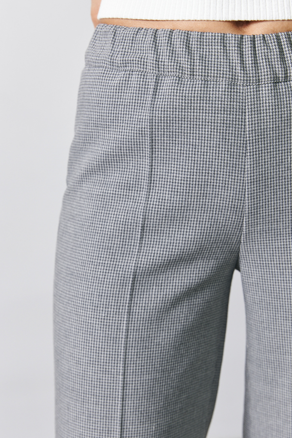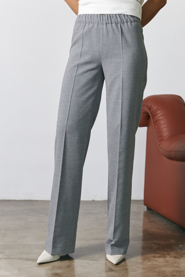 Брюки прямого силуэта из костюмной ткани. Пояс притачной с эластичной резиной. На передней части брюк застрочены стрелки.