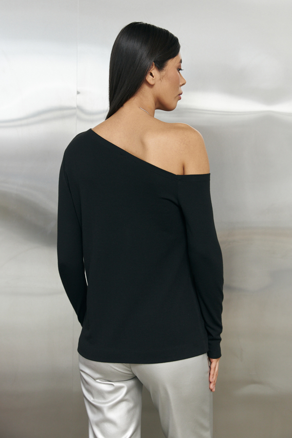 Джемпер полуприлегающего силуэта из мягкого эластичного полотна. Вырез горловины имеет асимметричную форму. Один рукав втачной, другой-типа реглан.