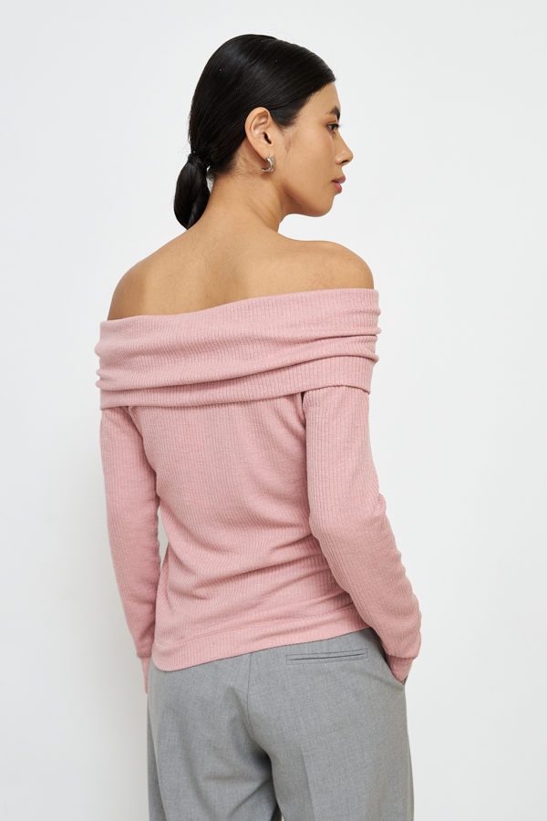 Модный джемпер с открытыми плечами из фактурного эластичного полотна. Линия плеч с эластичной резинкой. Длинный рукав реглан. Крой этого изделия позволяет создавать разные варианты ношения - на одно плечо или декольте.