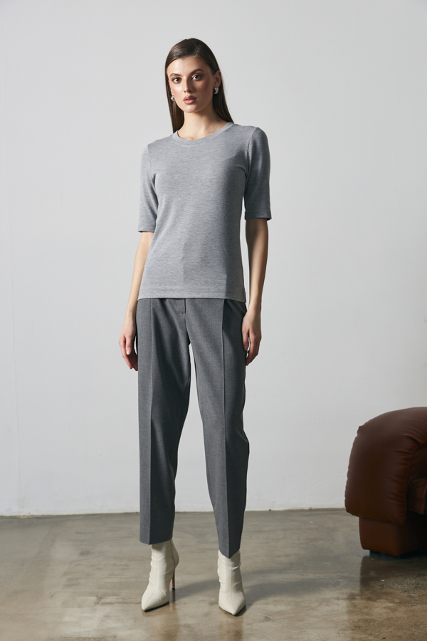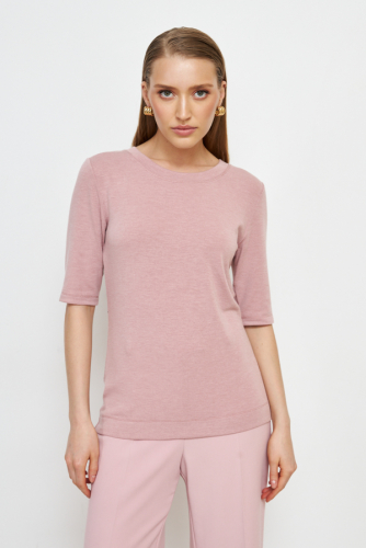 Джемпер прилегающего силуэта из меланжевого эластичного полотна. Втачной короткий рукав. Круглый вырез горловины оформлен бейкой. Джемпер – это хорошая базовая вещь, подходящая для любого гардероба.