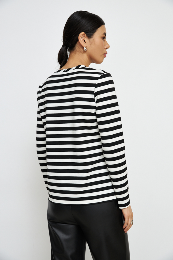 Джемпер свободного силуэта из эластичного полотна. Вырез горловины оформлен бейкой из основной ткани. Втачной длинный рукав.
