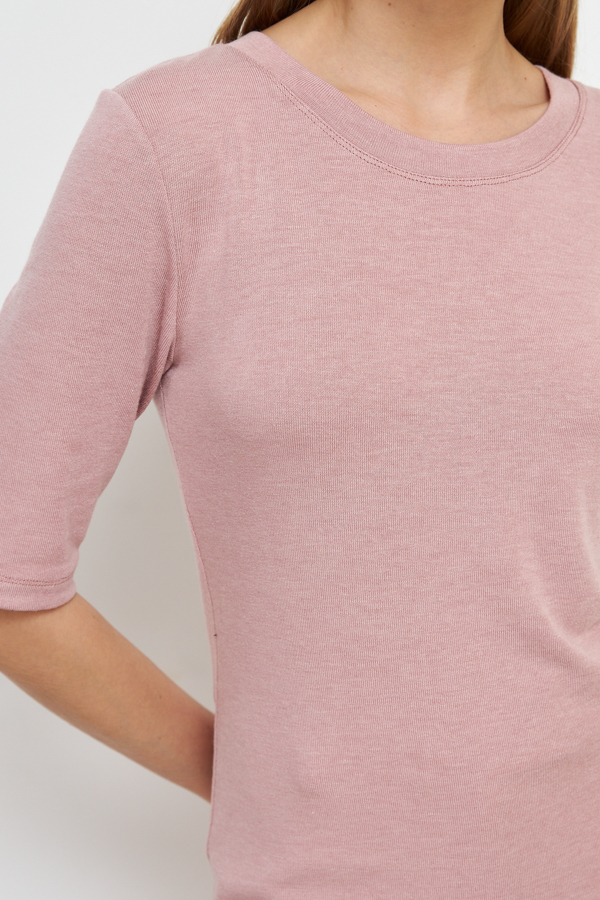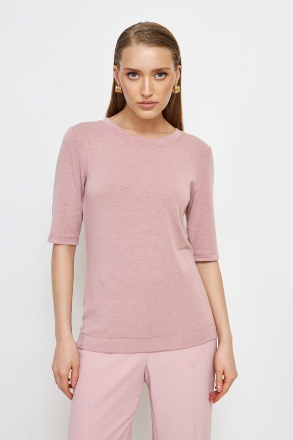 Джемпер прилегающего силуэта из эластичного полотна. Втачной короткий рукав. Круглый вырез горловины оформлен бейкой. Джемпер – это хорошая базовая вещь, подходящая для любого гардероба.