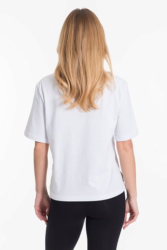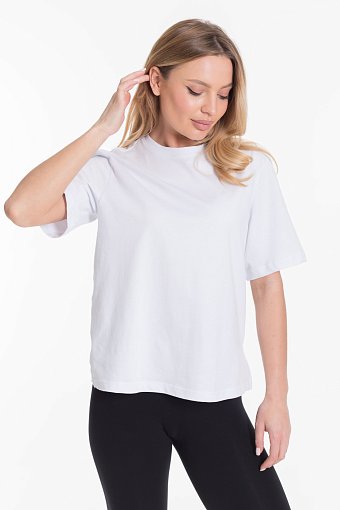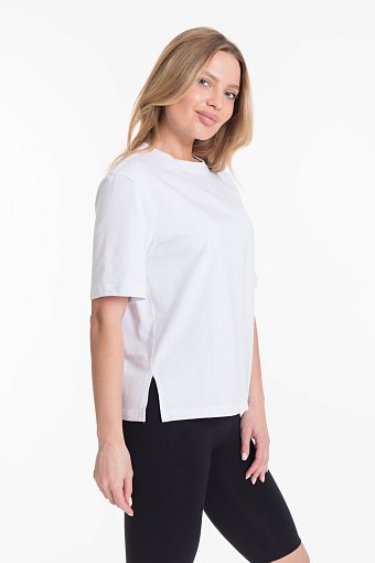 Женская футболка однотонного выполнена из мягкого и приятного на ощупь материала - кулирка. Она имеет короткий рукав и боковые швы с разрезами, что придаёт изделию оригинальность и свободу движений.