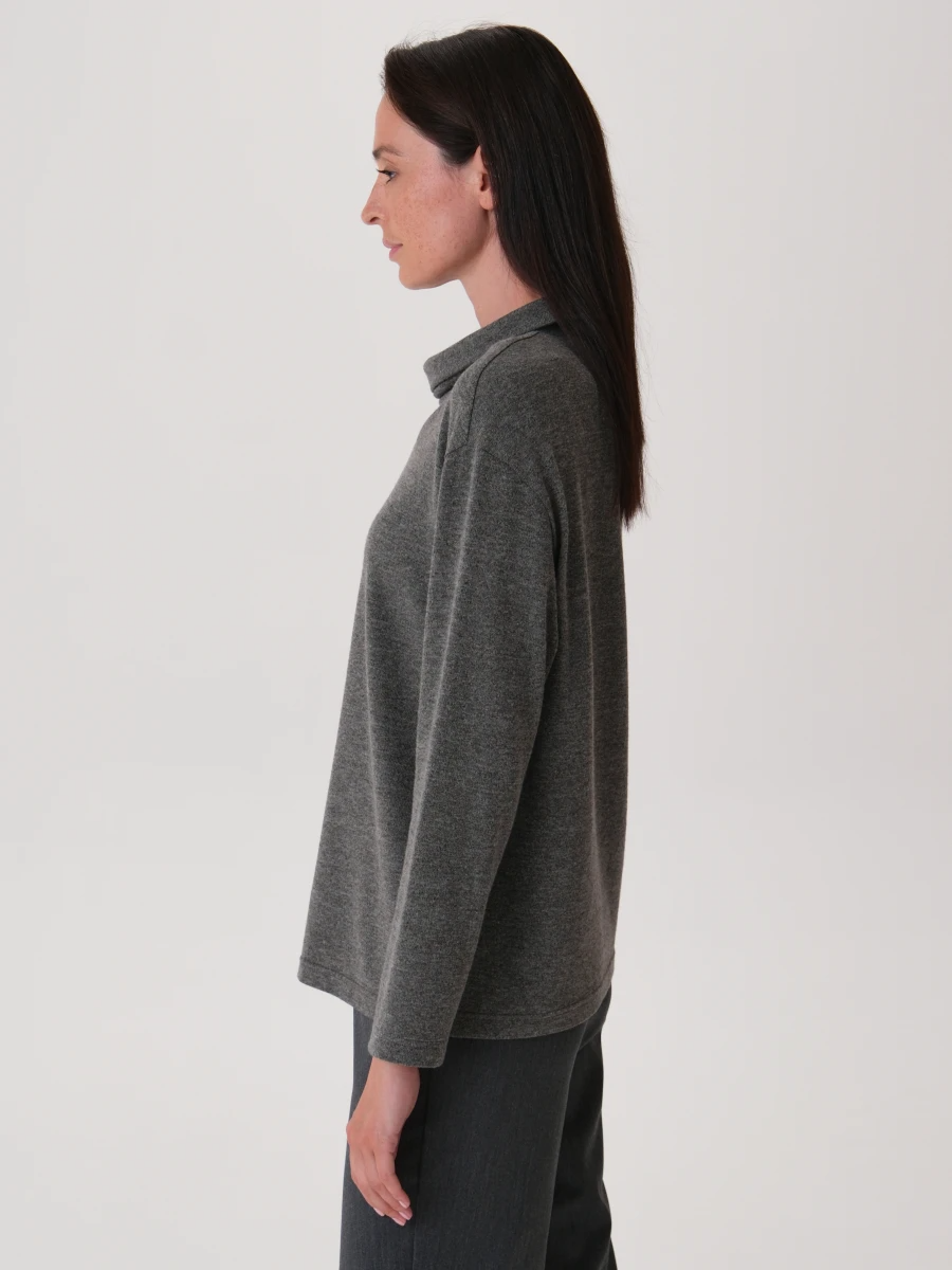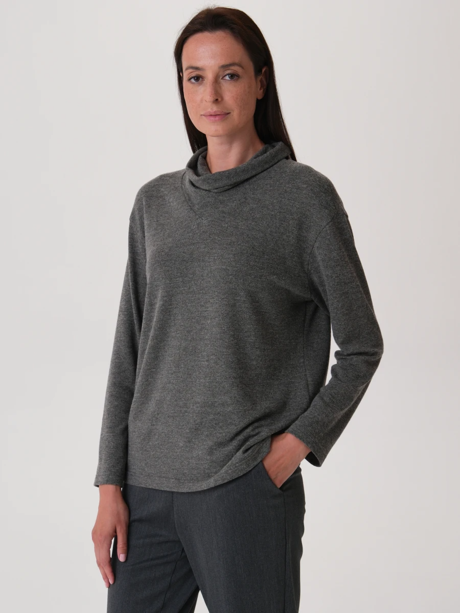 Базовая свободная водолазка в спокойном сером оттенке из мягкого трикотажа. Модель отлично впишется в уютные осенние-зимние образы. Плотная эластичная ткань приятно ложится к телу и благодаря особенностям кроя обеспечивает максимальный комфорт при носке. Данное изделие просто идеальный вариант для тех, кто не любит ощущение скованности. Высокий воротник со сборками свободно ложится к шее, а длинные объемные рукава прикрывают запястья.