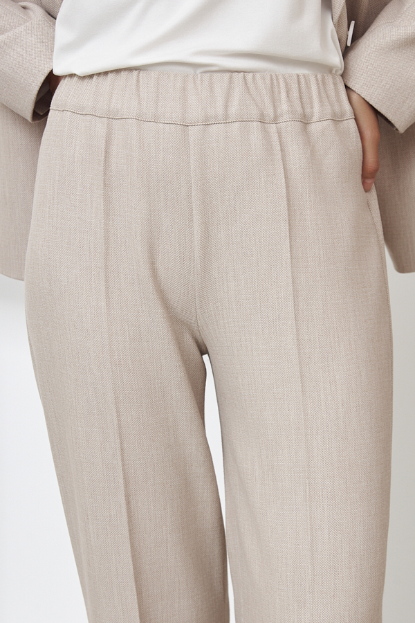 Брюки прямого силуэта из меланжевой костюмной ткани. Пояс притачной с эластичной резиной.