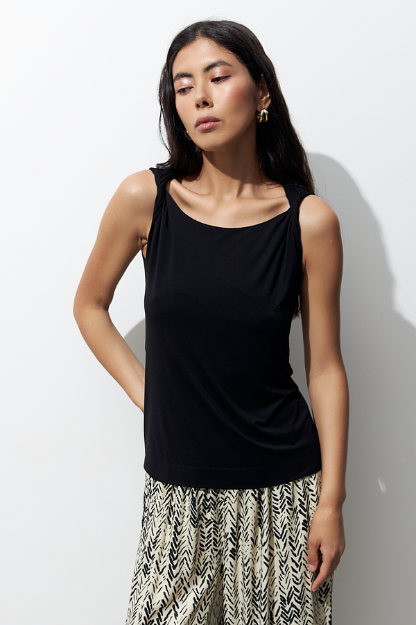 Джемпер полуприлегающего силуэта из вискозного эластичного полотна. Оригинальный крой с перекрутом на плечах. Изделие двухслойное с круглым вырезом горловины.