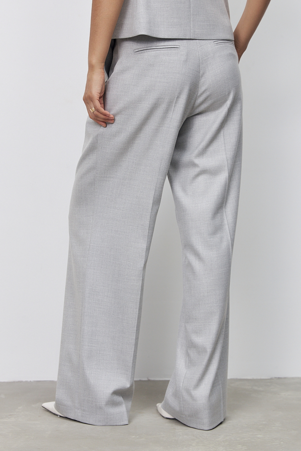 Брюки свободного силуэта из меланжевой костюмной ткани. На передней половинке выполнены карманы с подкройным бочком, по линии талии заложены складки. На задней половинке - талиевые вытачки и имитация карманов в рамку. Притачной пояс со шлёвками. Застёжка на молнию-гульфик и пуговицу. Такой крой выгодно подчеркнёт длину ваших ног.