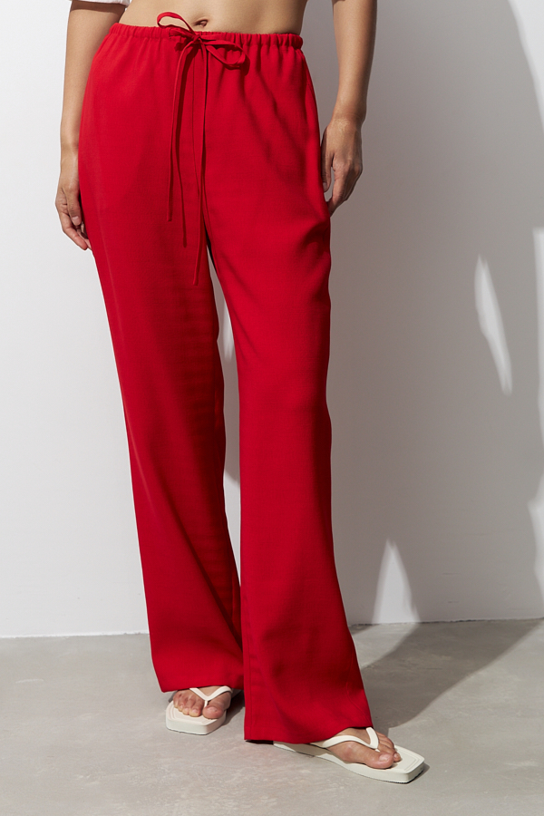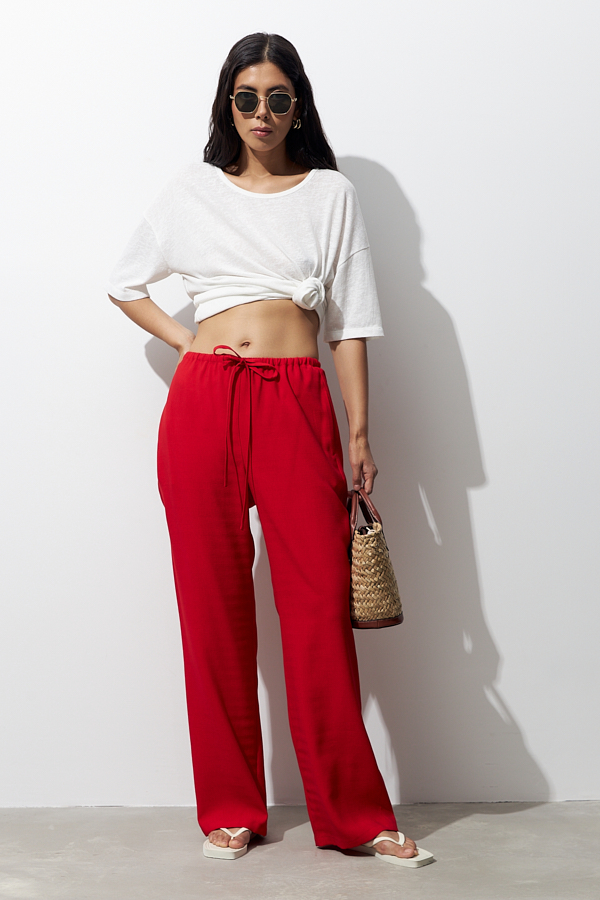 Брюки прямого силуэта из вискозной ткани с крэш-эффектом. Пояс с эластичной резиной и кулиской, в боковых швах карманы.