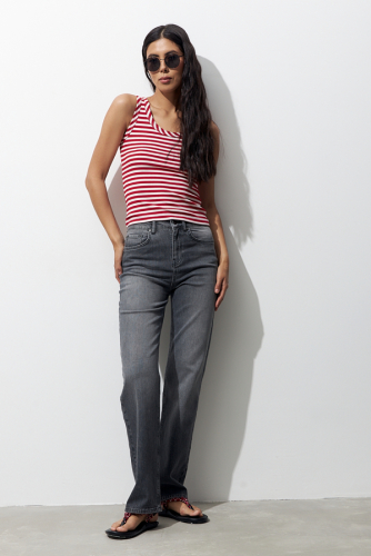 Брюки из эластичного денима выполнены по классической джинсовой технологии (варка с эффектом легкого выбеливания). Прямой классический крой. На задней части брюк выполнены накладные карманы, на передней - карманы с подкройным бочком. Притачной пояс со шлёвками. Застёжка на молнию-гульфик и пуговицу.