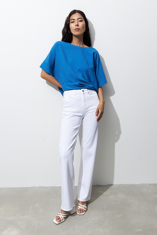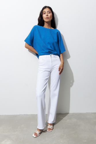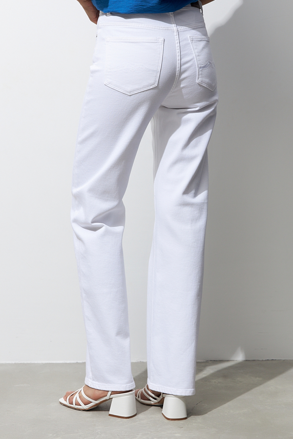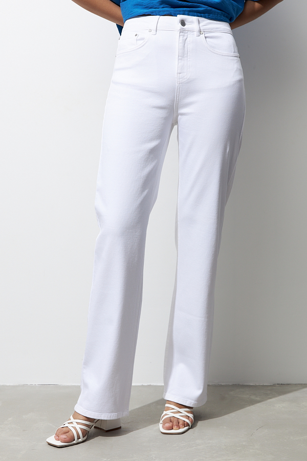 Брюки из эластичного денима выполнены по классической джинсовой технологии. Прямой классический крой. На задней части брюк выполнены накладные карманы, на передней - карманы с подкройным бочком. Притачной пояс со шлёвками. Застёжка на молнию-гульфик и пуговицу.