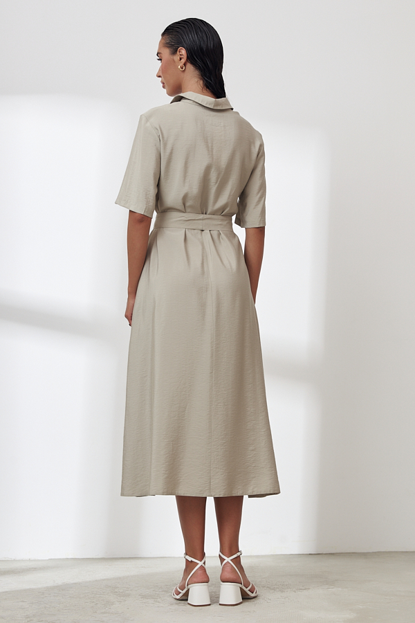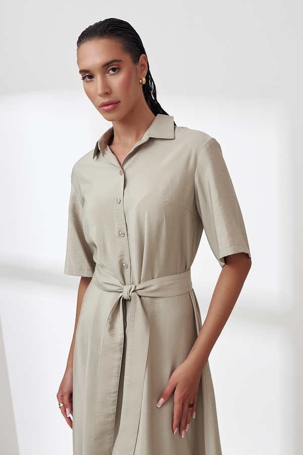 Платье из вискозной ткани с крэш-эффектом полуприлегающее в области груди и свободное в области бедер. Изделие отрезное по линии талии. Лиф с застёжкой на пуговицы. Вырез горловины обработан отложным воротником на стойке. Втачной короткий рукав. В комплекте пояс из основной ткани.