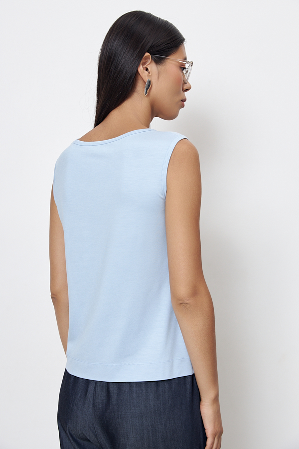 Топ из эластичного полотна полуприлегающего силуэта. Линия горловины и линия проймы окантованы эластичной бейкой.