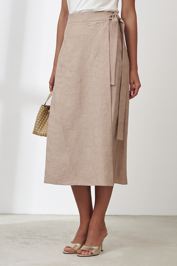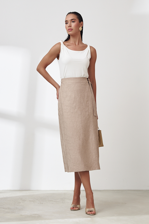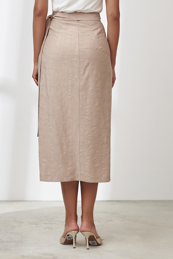Юбка из фактурной вискозной ткани с запахом на широких завязках. Прямой силуэт с притачным поясом. Изделие с запахом не только выглядят интересно, но и делают фигуру более гармоничной.