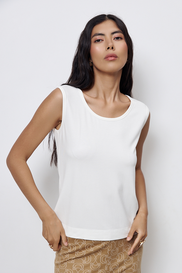 Топ из эластичного полотна полуприлегающего силуэта. Линия горловины и линия проймы окантованы эластичной бейкой.