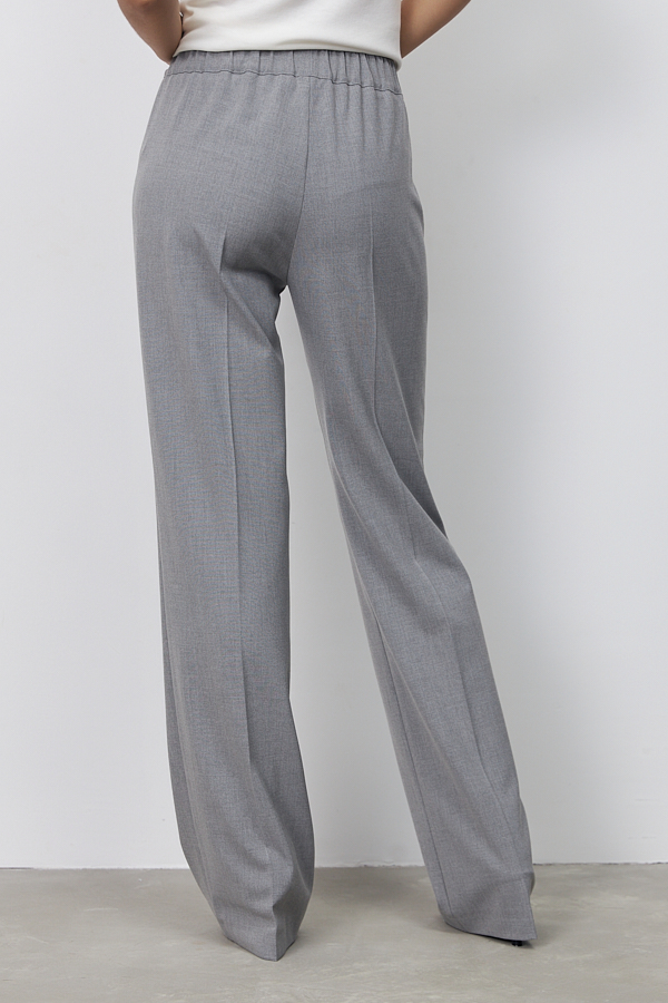 Брюки прямого силуэта из костюмной ткани. Пояс притачной с эластичной резиной.