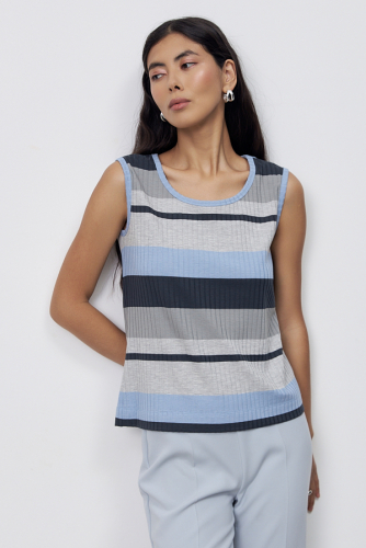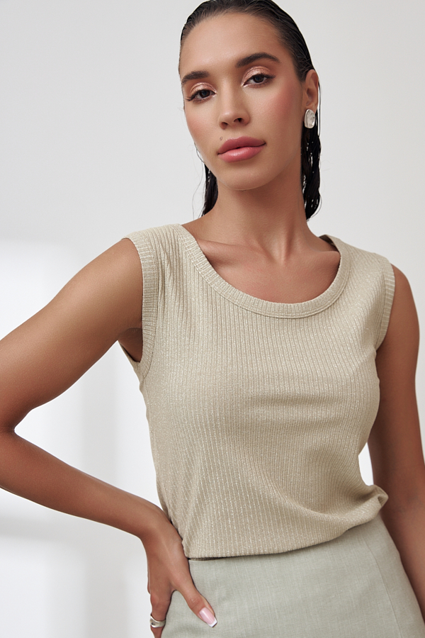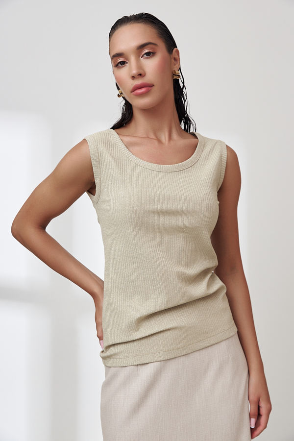 Топ из фактурного эластичного полотна с люрексом. Полуприлегающий силуэт. Линия горловины и линия проймы окантованы эластичной бейкой.
