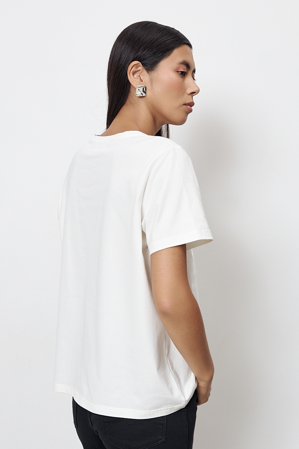 Джемпер из хлопкового эластичного полотна свободного силуэта. Втачной короткий рукав. Круглый вырез горловины оформлен бейкой. На передней части изделия нанесён принт методом шелкографии.