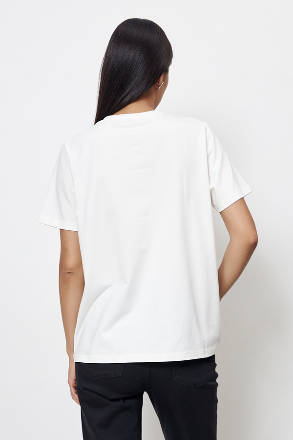Джемпер из хлопкового эластичного полотна свободного силуэта. Втачной короткий рукав. Круглый вырез горловины оформлен бейкой. На передней части изделия нанесён принт методом шелкографии.