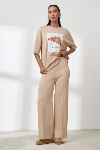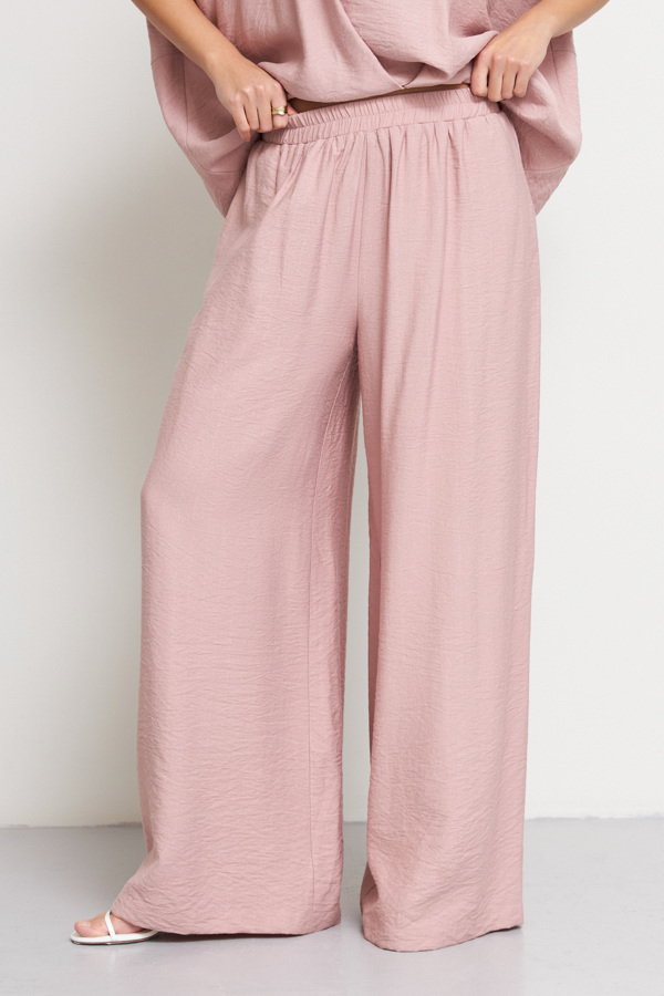 Брюки прямого свободного силуэта из вискозной ткани с крэш-эффектом. Пояс притачной с эластичной резиной, в боковых швах карманы.