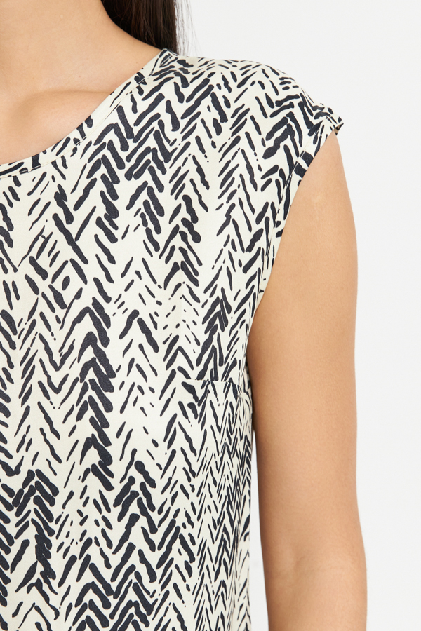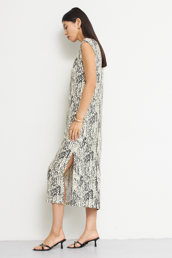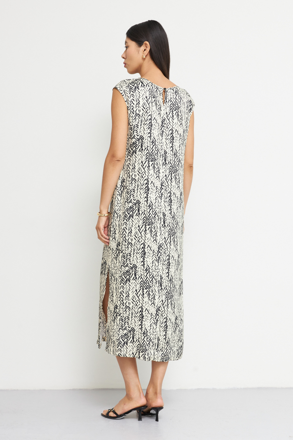 Платье из вискозной ткани с сатиновым блеском. Полуприлегающий силуэт, с разрезом в боковом шве. По среднему шву спинки застёжка на петлю-пуговицу. Круглый вырез горловины и линия проймы окантованы косыми бейками из основной ткани.