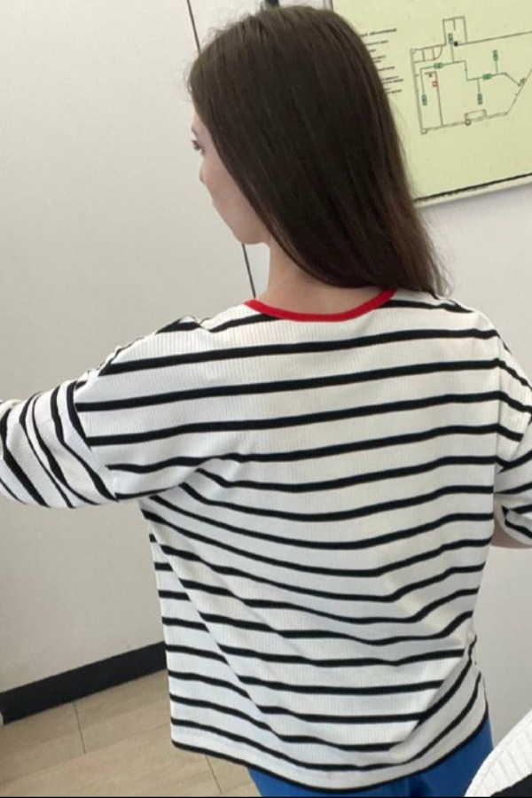 Джемпер из эластичного полотна. Свободный силуэт со спущенной линией плеча и коротким рукавом. Вырез горловины окантован эластичной бейкой. В таблице размеров представлены параметры человека, а не изделия.