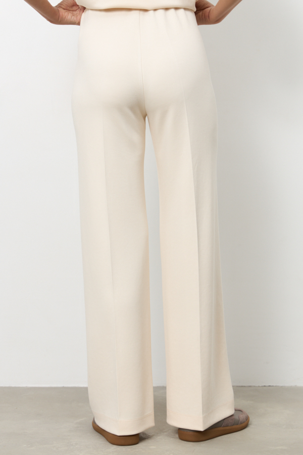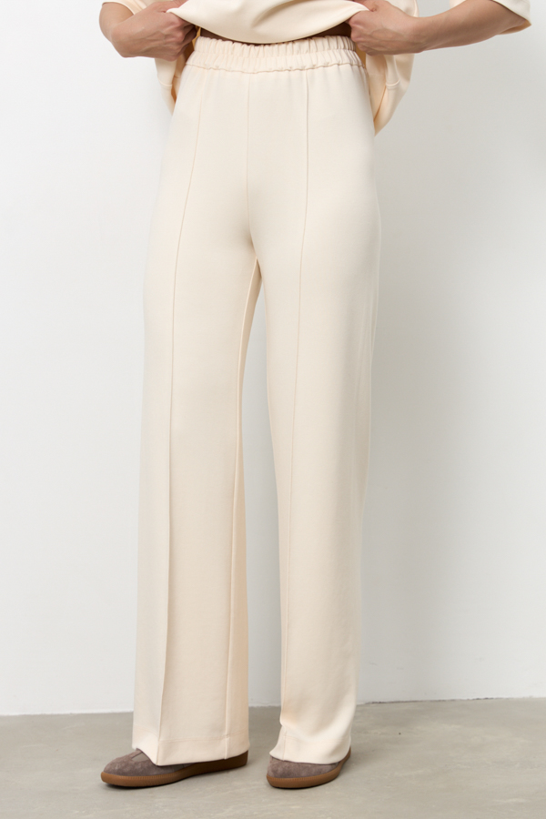 Брюки прямого силуэта из эластичного полотна. Пояс с эластичной резиной. На передней части брюк застрочены стрелки.