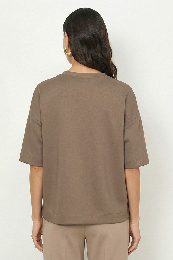 Джемпер свободного силуэта со спущенной линией плеча и рукавом до локтя выполнен из эластичного полотна. Вырез горловины оформлен бейкой из основной ткани. На передней части изделия выполнена аппликация. В таблице размеров представлены параметры человека, а не изделия.