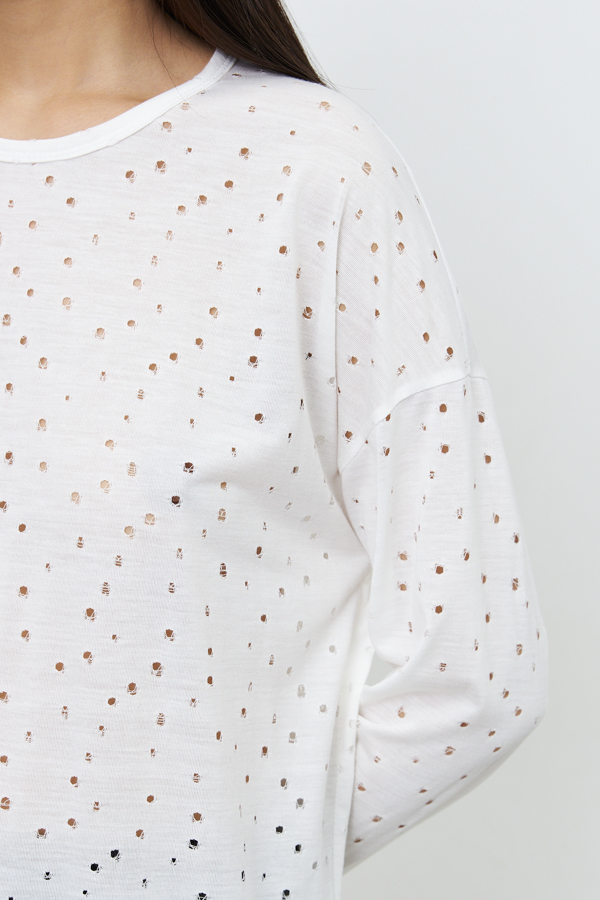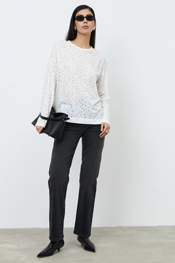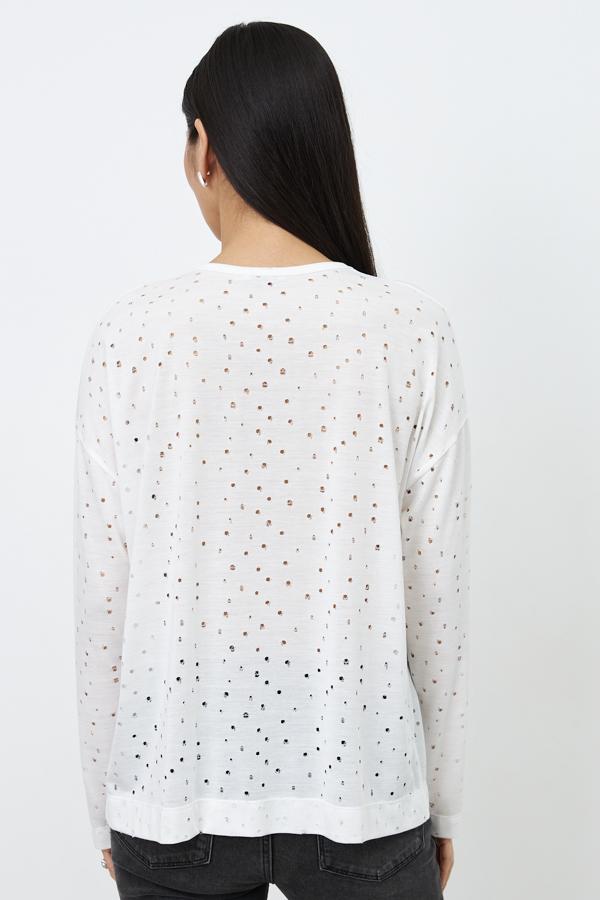 Джемпер из эластичного полотна с перфорацией. Свободный силуэт со спущенной линией плеча и длинным рукавом. Вырез горловины окантован эластичной бейкой. В таблице размеров представлены параметры человека, а не изделия.