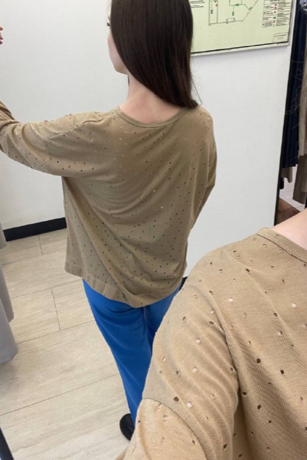 Джемпер из эластичного полотна с перфорацией. Свободный силуэт со спущенной линией плеча и длинным рукавом. Вырез горловины окантован эластичной бейкой. В таблице размеров представлены параметры человека, а не изделия.