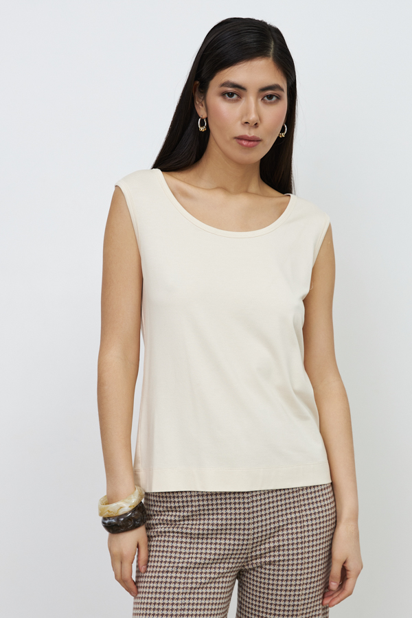 Топ из эластичного полотна полуприлегающего силуэта. Линия горловины и линия проймы окантованы эластичной бейкой.