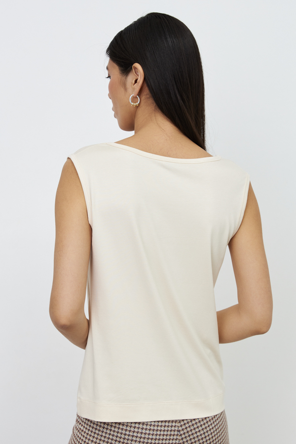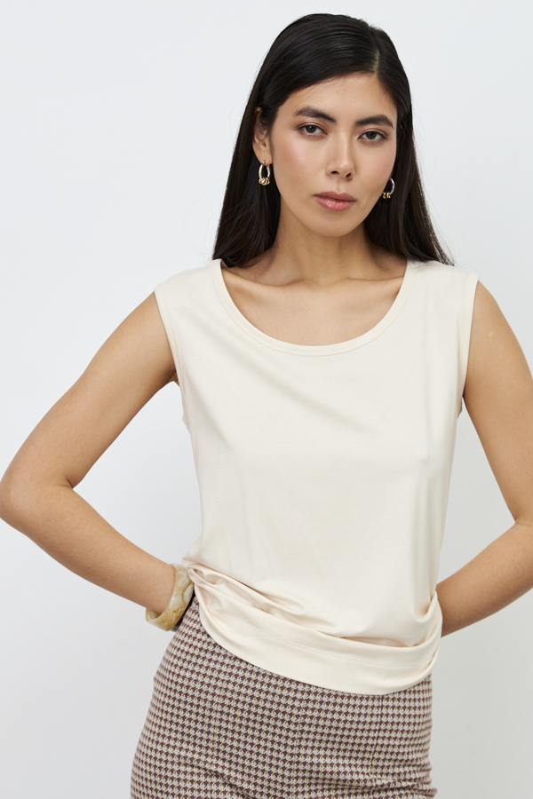 Топ из эластичного полотна полуприлегающего силуэта. Линия горловины и линия проймы окантованы эластичной бейкой.