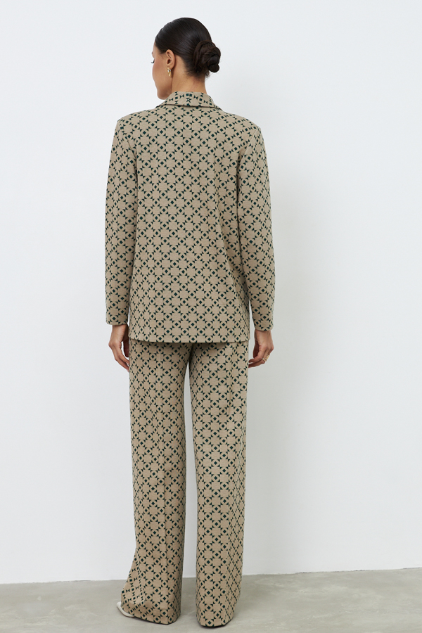 Костюм из эластичного полотна. Брюки прямого силуэта. Пояс с эластичной резиной. Жакет прямого свободного кроя с женственным шалевым воротником. На передней части изделия застёжка на пуговицу и накладные карманы. Втачной рукав. Изделие с плечевыми накладками, которые при желании можно убрать.