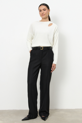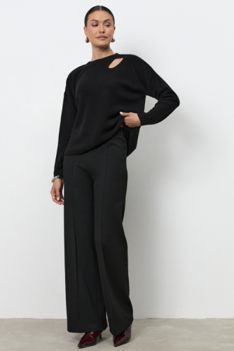 Брюки прямого силуэта из эластичного полотна. Пояс с эластичной резиной. На передней части брюк застрочены стрелки.