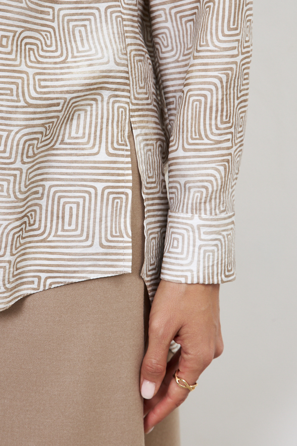 Рубашка свободного силуэта из вискозной ткани с застёжкой на пуговицы. Низ изделия асимметричной длины (спинка удлинена относительно переда) с закруглениями по бокам и разрезами. Рубашечный рукав на манжете с застёжкой на пуговицы. Вырез горловины обработан отложным воротником на стойке. На задней части изделия выполнена кокетка с небольшой складкой. Достоинство этой модели в способности скрыть некоторые недостатки фигуры. Её можно сочетать как с брюками, так и с джинсами.