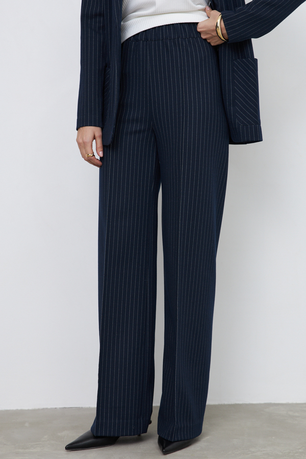 Костюм выполнен из эластичного полотна. Брюки прямого силуэта. На передней части брюк застрочены стрелки. Пояс с эластичной резиной. Жакет прямого силуэта с английским воротником и накладными карманами. На передней части жакета застежка на пуговицу. Втачной длинный рукав. Изделие с плечевыми накладками, которые при желании можно убрать.