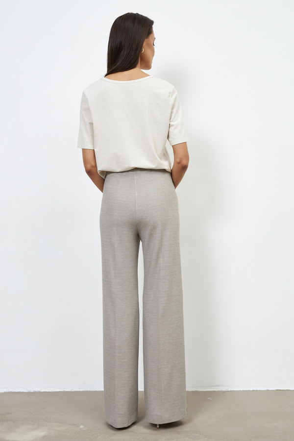 Брюки из эластичного полотна прямого силуэта. Пояс с эластичной резиной. На передней части брюк застрочены стрелки.