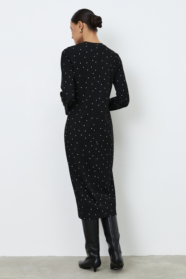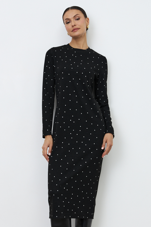 Платье полуприлегающего силуэта из эластичного полотна. Круглый вырез горловины оформлен притачной бейкой. Втачной длинный рукав.