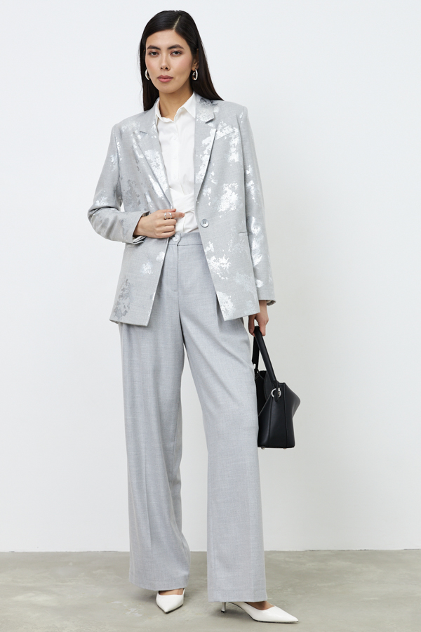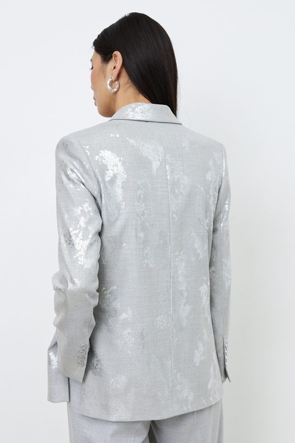 Жакет из костюмной ткани с мерцающим накатом. Прямой силуэт с разрезами в боковых швах. Изделие с английским воротником и застежкой на пуговицу. На передней части жакета выполнен нагрудный карман с листочкой и карманы в рамку. Втачной длинный рукав, снизу шлица с пуговицами. Изделие идеально держит форму, имеет четкую линию плеча благодаря плечевым накладкам. Жакет на подкладке.