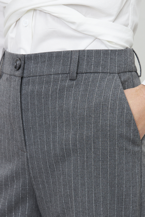 Брюки из костюмной ткани прямого силуэта. Застёжка на молнию-гульфик и пуговицу. В боковых швах выполнены карманы с подкройным бочком. Притачной пояс со шлёвками. На задней половинке брюк карманы в рамку с пуговицей, на поясе вставка с резиной.