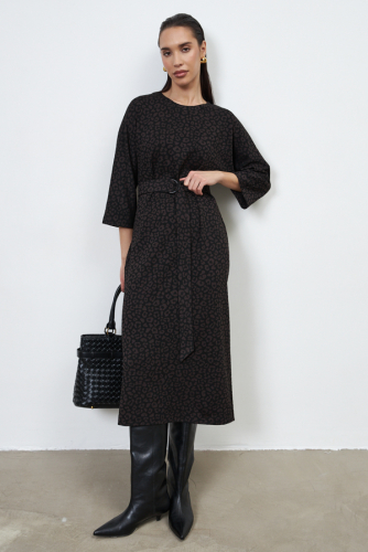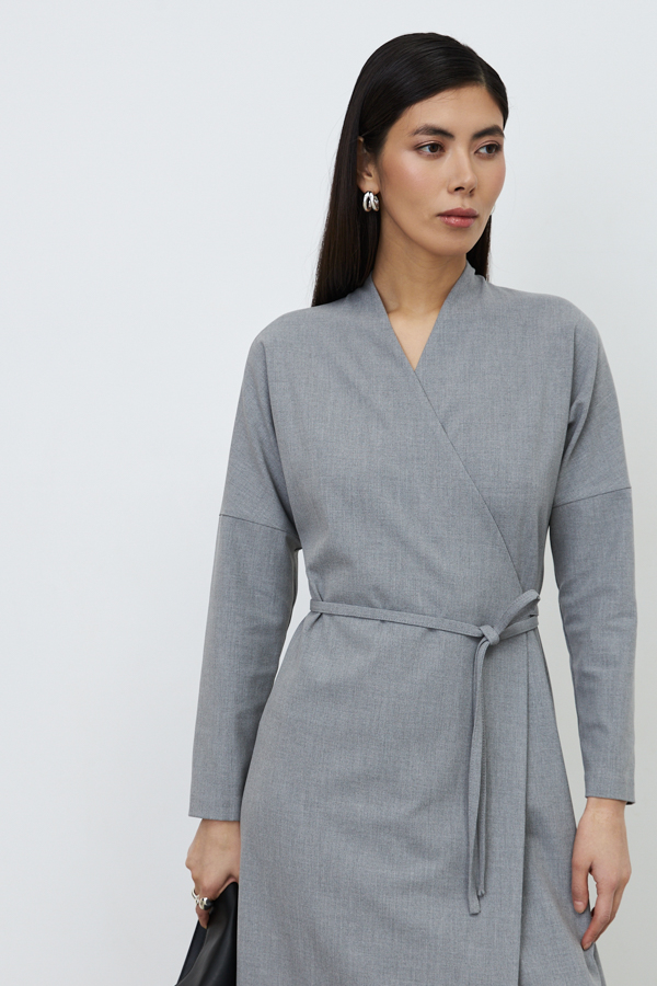 Платье прямого силуэта из плательной ткани. Глубокий V-образный вырез горловины плавно переходит в запах, фиксируется притачным поясом. Втачной длинный рукав в спущенную пройму.