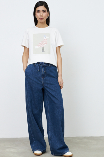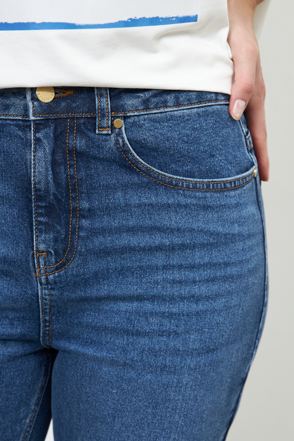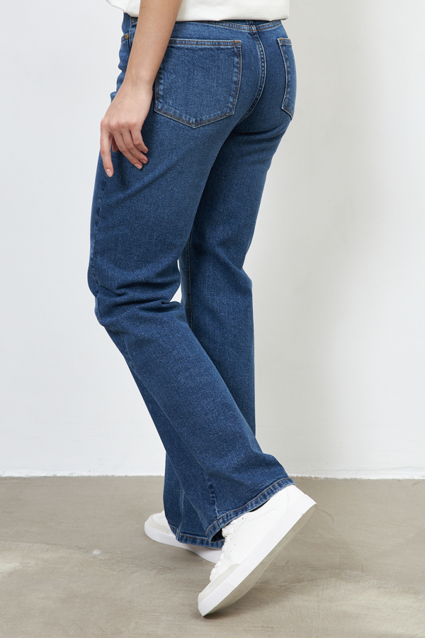 Брюки из эластичного денима выполнены по классической джинсовой технологии (варка с эффектом легкого выбеливания). Прямой классический крой. На задней части брюк выполнены накладные карманы, на передней - карманы с подкройным бочком. Притачной пояс со шлёвками. Застёжка на молнию-гульфик и пуговицу.