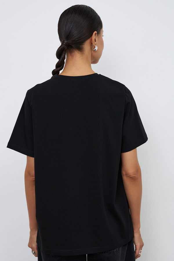 Джемпер из хлопкового эластичного полотна свободного силуэта. Втачной короткий рукав. Круглый вырез горловины оформлен бейкой.