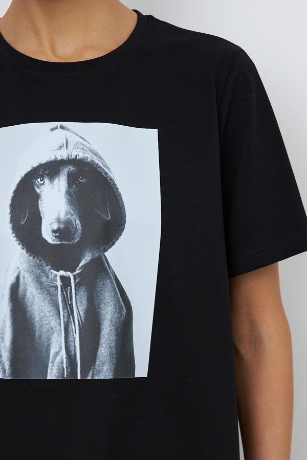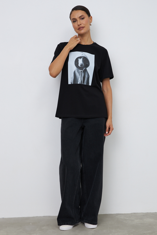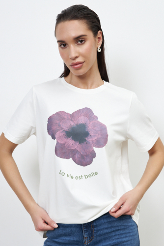 Джемпер из хлопкового эластичного полотна свободного силуэта. Втачной короткий рукав. Круглый вырез горловины оформлен бейкой.