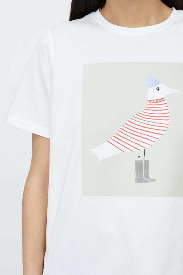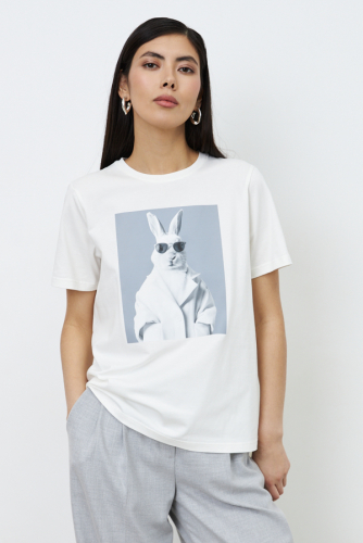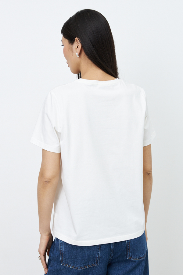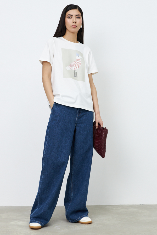 Джемпер свободного силуэта из хлопкового эластичного полотна. Втачной короткий рукав. Круглый вырез горловины оформлен бейкой.